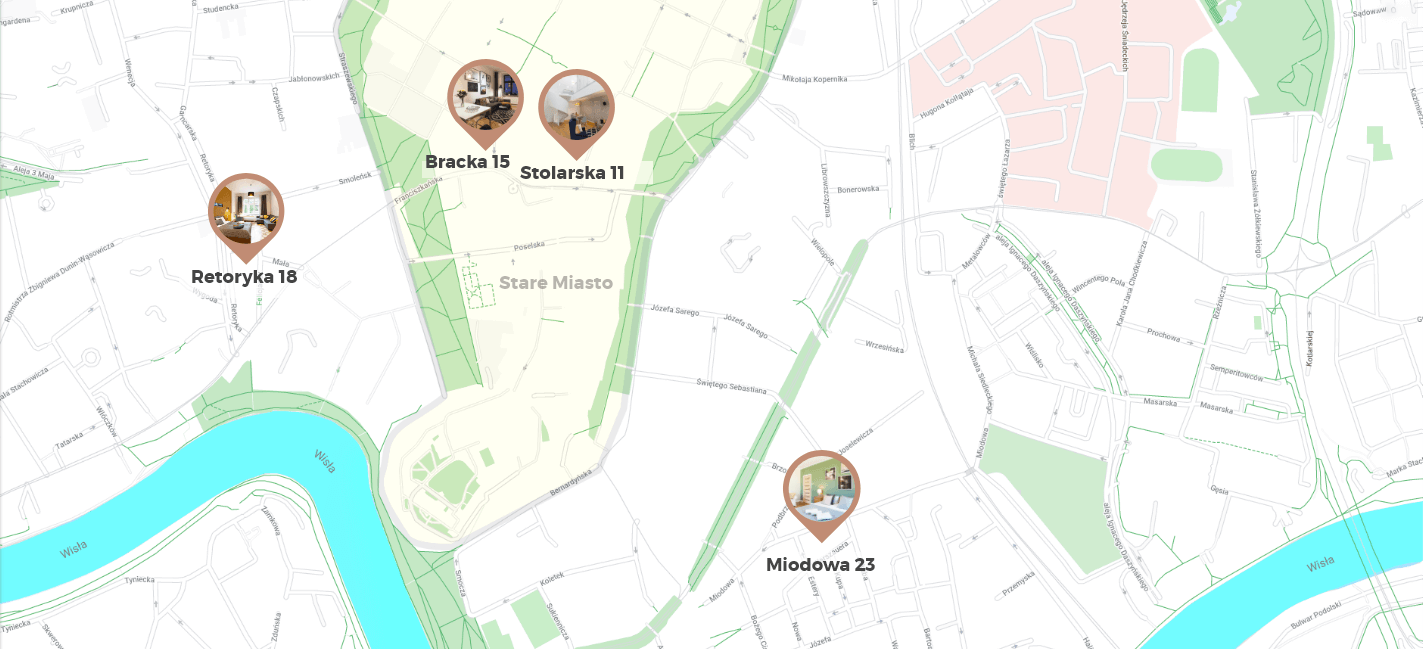 W swojej ofercie mamy ponad 20 apartamentów w 3 lokalizacjach - tuż przy Rynku Głównym, w samym sercu krakowskiego Kazimierza oraz przy Dworcu Głównym w Krakowie.